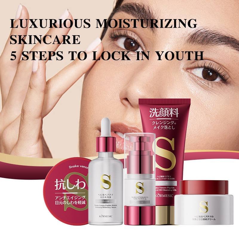Function:A snake venom facial set is a high-performance skincare collection formulated with synthetic snake venom peptides that mimic the effects of actual snake venom (typically modeled after the venom of the Temple Viper). These peptides are known for their anti-aging, wrinkle-reducing, and skin-firming properties. A snake venom set often includes products like cleanser, serum, face cream, eye cream, and mask, all aimed at giving the skin a smooth, youthful, and lifted appearance.